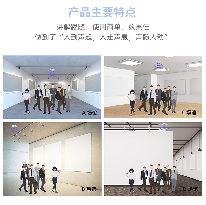 團隊分區講解系統,也被稱為團隊智慧講解系統、展廳分區講解系統、展館講解系統、分區解說系統、分區跟隨講解系統等不同稱謂,適用于講解員向游客進行團隊講解的情況,講解員可手持無線講解發射器進行語音講解,參觀者無需佩戴耳機,也可以聽到現場預先安裝的分區擴音設備發出的聲音,避免耳機對參觀者造成的不適及分發和回收耳機的不便,或其他擴音設備(例如小蜜蜂等便攜擴音設備)在中大團隊講解中出現后排游客聽不清楚的情況。游客體驗較好,講解員走到哪里聲音就在哪里發出,避免多個團隊相互之間干擾。講解區域之間采用淡入淡出的不間斷、無縫平滑切換方式。“人到聲起,人走聲息,聲隨人動、如影隨形”。