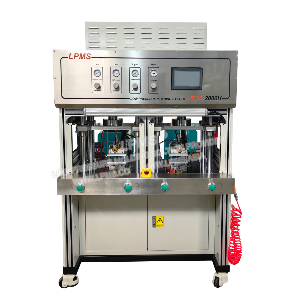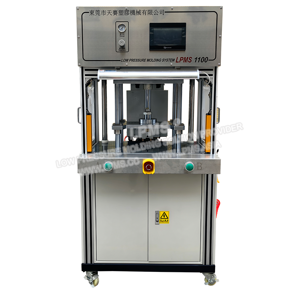 LPMS 600側式低壓注膠機的工作臺和熔膠系統為一體式設計,其注膠槍位於模具側面,從模具側面注膠,當產品較大時模具只能設計為一模一穴,採用側式低壓注膠可避免在產品正上方注膠而留下進料痕影響產品美觀。適合封裝尺寸較大或外形複雜產品。